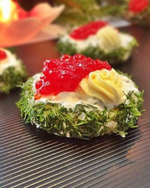 С икрой и сливочным маслом. Из ломтиков батона вырежьте стаканом кружочки, боковые стороны обмажьте размягченным сливочным маслом. Обваляйте кружочки в нарезанном мелко укропе, сверху выложите по 1 ч. л. взбитых сливок и красной икры. По желанию с помощью кондитерского мешка добавьте розочку из подсоленного сливочного масла.