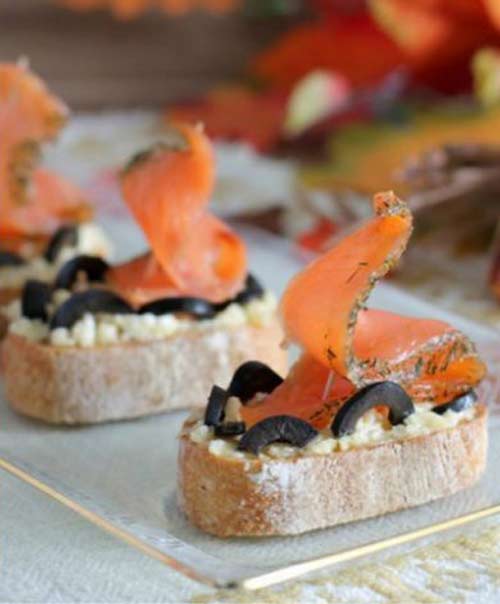 С сыром, семгой и маслинами. Твердый сыр натрите на мелкой терке, добавьте немного майонеза для вязкости. Подготовленной пастой намажьте подрумяненные на сухой сковороде (в тостере) ломтики багета. Украсьте колечками маслин по периметру, а по центру бутерброда закрепите на шпажке ломтик слабосоленой семги.