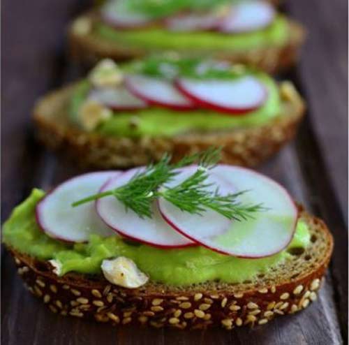С пастой из авокадо и редисом. Мякоть авокадо пюрируйте в блендере, добавьте щепотку соли, лимонный сок и немного цедры. Фундук поджарьте на сухой сковороде, растолките скалкой. Редис нарежьте тонкими кружочками. Ломтики ржаного хлеба с отрубями намажьте пастой из авокадо, сверху выложите кружочки редиса, посыпьте толченым фундуком, украсьте веточками укропа.
