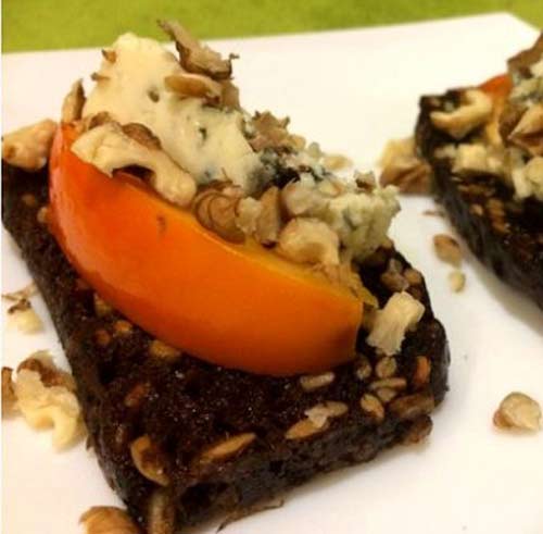 С хурмой и сыром. Ломтики ржаного хлеба с семечками подсушите на сковороде или в тостере. Хурму нарежьте дольками. Мягкий сыр (лучше бри, но можно и сливочный) разомните вилкой. На хлеб выложите каплю сырной массы, закрепите на ней дольку хурмы, сверху выложите еще 1 ч. л. мягкого сыра. Завершите композицию, посыпав бутерброд измельченными грецкими орехами.