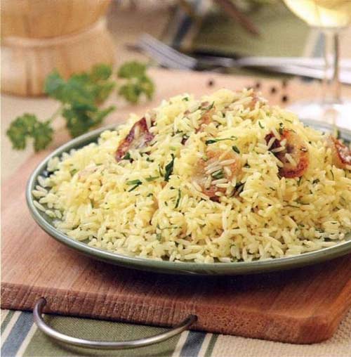 На 150 г риса: 40 г сливочного масла, 1 луковица, 50 г ветчины, 50 г куриной печенки, 100 г грибов, 200 г бульона, соль – по вкусу.