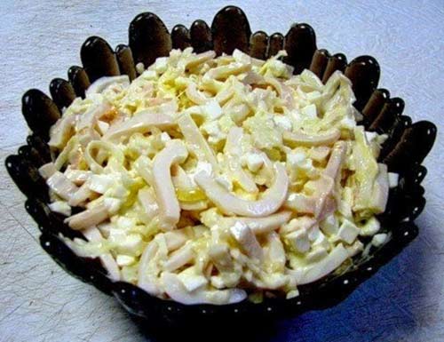 На 500 г кальмаров: 500 г вешенок (или других грибов), 4 яйца, сваренных вкрутую, 2 луковицы, майонез по вкусу.