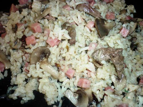 Обжаренный (без масла) отварной рис, нарезанную ломтиками и чуть припущенную с маслом куриную печенку, нарезанную кубиками вареную ветчину и нарезанные ломтиками грибы (замороженные или отваренные сухие) перемешайте, залейте горячим бульоном или водой, доведите до кипения, посолите и тушите под крышкой (лучше всего – в духовке) 15-20 минут.