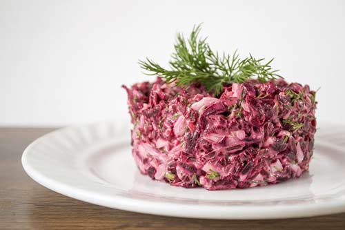 Свёклу отварите, остудите, очистите, натрите на крупной терке и уложите на дно салатницы. Вторым слоем распределите йогурт так, чтобы он закрывал свёклу. Сверху распределите толченый грецкий орех, потом – натертые на мелкой терке яйца (приминать не надо). Следующий слой – натертый на мелкой терке сыр. И снова йогурт. Сверху украсьте зеленью.
