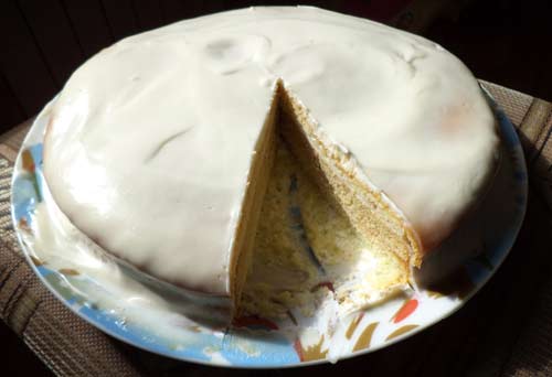 3 яйца, 1 ст. кефира, 1 ст. сахара, 1/2 ч. л. соды, 2 ст. муки. Для крема: 500 г сметаны, 100 г сахара.