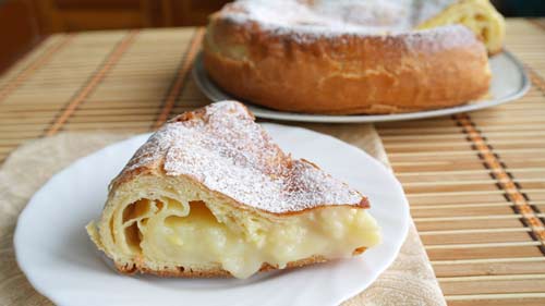 Для слоеного дрожжевого теста: 1 ст. молока, 200 г сливочного масла, 700 г муки, 1 яйцо, 2 ст. л. сахара, 1/2 ч. л. соли, 1/2 ч. л. сухих дрожжей. Для заварного крема: 2 ст. молока, 1 ст. сахара, 3 ст. л. картофельного крахмала, 1 яйцо, 1 г ванилина.