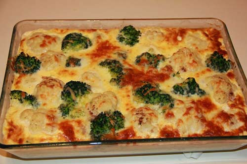 500 г цветной капусты, 500 г брокколи, 150 г сливочного масла, 1 ст. молока, 2 ст. л. муки, 150 г твердого сыра, итальянские травы, 1/2 ч. л. соли.