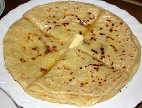 400 г муки, 1 ст. кефира, 1 ч. л. соды, 1 ч. л. соли, 300-400 г адыгейского сыра, большой пучок зелени (укроп, петрушка, кинза), масло сливочное для смазывания лепешек. Для соуса: 200 мл мацони (можно заменить густым йогуртом без добавок), 2 зубчика чеснока, 3 ст. л. измельченной зелени.