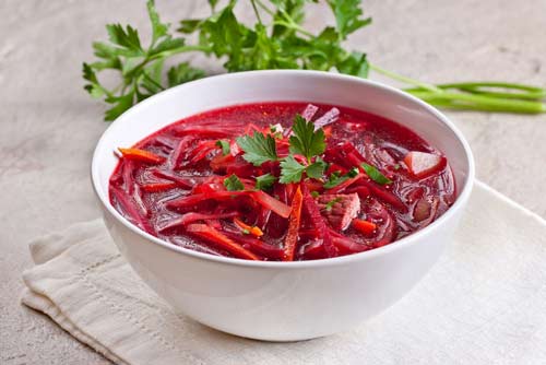 250-500 г капусты, 1-2 моркови, 1-2 свёклы, 2-3 некрупные картофелины, 1-2 луковицы, 200-300 г домашних помидоров в собственном соку, несколько долек чеснока, растительное масло, соль, специи, свежая зелень – по вкусу, немного уксуса – по желанию.