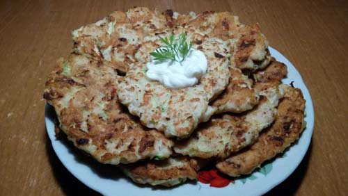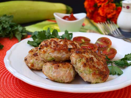 1 средний кабачок (с молодой кожицей), 250 г куриного филе, 2 яйца, 4 ст. л. овсяных хлопьев, 2 ст. л. сметаны, 1 ст. л. крахмала, зелень, специи, соль – по вкусу, растительное масло для жарки.