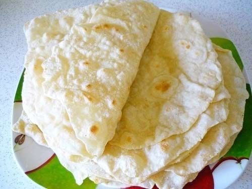 Замесите тесто, оно получится мягким и эластичным. Разделите на 20-16 шариков, всё зависит от диаметра сковороды. Накройте пленкой и дайте тесту постоять 20 минут. Раскатайте тонкую лепешку и потом еще растяните в руках как можно тоньше. Обжарьте на разогретой сковородке без жира по несколько секунд с каждой стороны. Снимите на заранее приготовленную поверхность и хорошо обрызгайте еще горячее изделие водой, накройте пленкой. И так – с каждой лепешкой.