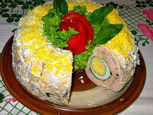 Отварите вкрутую 8 яиц, охладите и почистите. Листья шпината сложите стопочкой в шумовку, придавите ложкой и так опустите в кипяток. Как только они обмякнут, выньте, промойте холодной водой и выложите на тарелку. К куриному фаршу добавьте мелко нарезанный лук, хлеб без корочки, размоченный в теплом молоке, яйцо, соль, перец и куриную приправу. Всё хорошо вымешайте и отбейте. Даже если окажется лишний фарш, из него можно приготовить несколько вкусных котлет. Филе нарежьте кусочками и очень тонко отбейте под пищевой пленкой, посолите и поперчите. 7 вареных яиц оберните листиками шпината, можно в несколько слоев. Смажьте форму для кекса маслом и выложите в нее куриные отбивные. Несколько штук оставьте, чтобы накрыть рулет сверху. Выложите часть фарша, сверху уложите яйца в шпинате, потом снова фарш и накройте всё отбивными. Смажьте рулет маслом, чтобы он не запекся преждевременно, и накройте фольгой. Выпекайте в течение часа в духовке, разогретой до 180 градусов, а потом еще 45 минут без фольги и остудите. Украсьте тертым вареным яйцом.