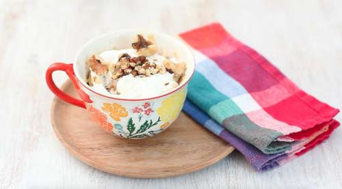 1/3 ст. муки, 1/2 ч. л. разрыхлителя, 2 ст. л. сахара, 1/4 ч. л. корицы, щепотка соли, 1 ст. л. молока, 2 ст. л. растопленного сливочного масла, 2 ст. л. размешанного яйца (желток с белком), 1/4 ч. л. ванильного сахара (или ванильного сиропа), 3 ст. л. тертой моркови, 2 ст. л. измельченных грецких орехов, 2 ст. л. сливочного сыра для украшения («Маскарпоне», «Филадельфия») или взбитых сливок.
