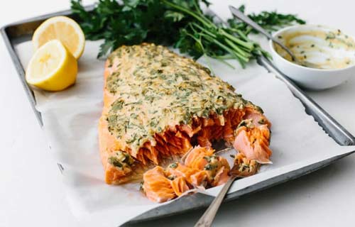 400 г лосося, 50 г дижонской горчицы, 50 г зелени петрушки, 1 ст. л. лимонного сока, 1 ст. л. масла авокадо, 3 зубчика чеснока, 1/2 ч. л. соли.