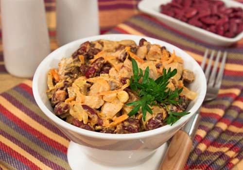 Нарежьте морковь крупной соломкой и обжарьте до полуготовности. Лук нарежьте полукольцами и обжарьте до золотистого цвета. Отварите печень и нарежьте тонкой соломкой. Смешайте вместе печень, морковь, лук, фасоль, измельченный чеснок, рубленную кинзу, посолите и поперчите. Заправьте по вкусу оливковым маслом или майонезом.