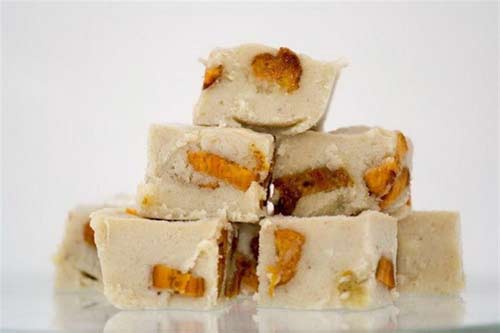 200 мл воды, 200 г сахара, 400 г бананов, 50 г кураги, 50 г изюма, 50 г миндаля, 200 г сухого молока, 100 г сливочного масла.