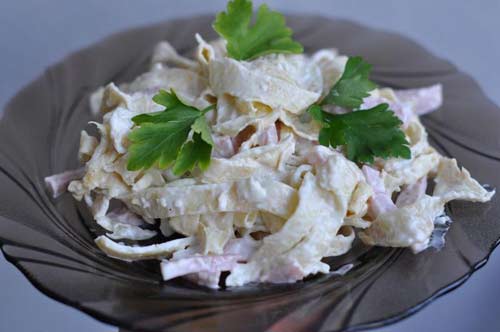 Взбейте яйца с солью. Пожарьте блинчики на разогретой сковородке с небольшим количеством растительного масла (получится 4-5 штук), остудите их и нарежьте на тонкие полоски. Ветчину нарежьте тонкой соломкой. Смешайте блинчики, ветчину, пропущенный через пресс чеснок, соль, перец, заправьте майонезом и перемешайте.