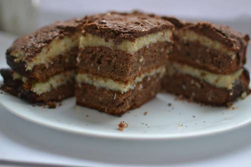 Для теста: 2 ст. муки, 1 ст. кефира, 3 яйца, 1 ст. сахара, 1 ст. л. какао, 1/2 ч. л. соды (погасить). Для крема: 500 г сметаны, 100 г сахара, орехи, цукаты – по вкусу.