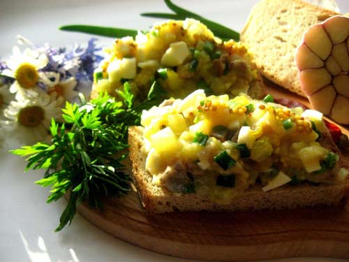 300 г филе слабосоленой сельди, 200 г корнишонов (или обычных маринованных огурцов), 2 яйца, зеленый лук, горчица в зернах, хлеб, соль – по вкусу.