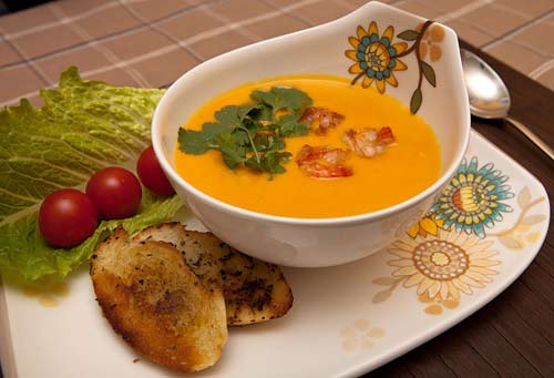 Крупно нарезанный лук и мелко нарезанную морковь обжарьте в оливковом масле. Тыкву очистите, нарежьте на кубики 2х2 см и варите 7 минут на слабом огне с обжаренными овощами и специями до мягкости тыквы. Затем суп измельчите блендером до однородности. Залейте суп-пюре сливками, перемешайте и дайте ему немного настояться под крышкой. Нашинкованный чеснок обжарьте до золотистости, добавьте очищенные от панцирей креветки и жарьте на среднем огне до готовности креветок. Поджарьте на оливковом масле кусочки белого хлеба со специями (например, с орегано и базиликом). Разлейте суп по тарелкам, в каждую положите немного креветок и чеснока, украсьте зеленью и подавайте с только что обжаренными гренками.