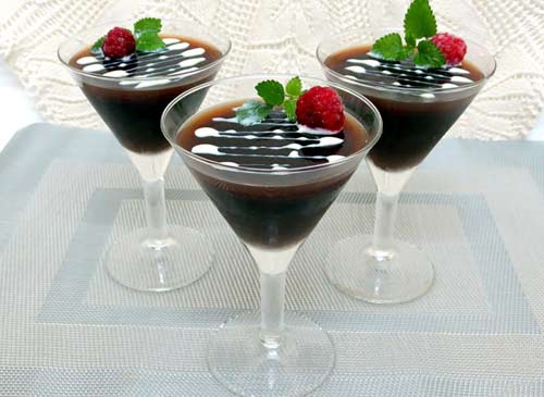 2 ст. л. какао, 300 мл молока, 10 г желатина, 3 ст. л. сахара, 1 пакетик ванильного сахара. Для украшения: свежие фрукты, сироп или сгущенное молоко.