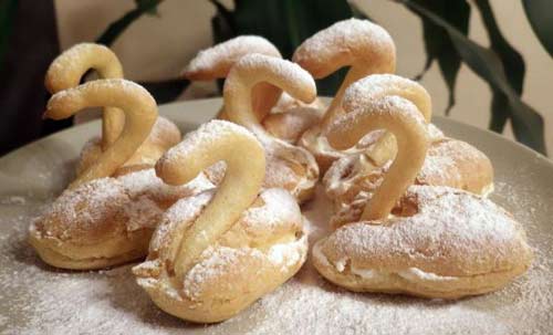 Влейте воду в кастрюлю, добавьте масло и соль. Довести массу до кипения и полного растворения масла. В кипящую масляную массу быстро всыпьте муку и тщательно перемешайте. Убавьте до минимума и энергично мешайте тесто, оно должно стать эластичным. Слегка подсушив тесто, держите кастрюлю на огне не более минуты. Затем тесто немного остудите и добавьте яйца по одному, каждый раз хорошо перемешивая тесто. Хорошо вымесите заварное тесто, оно должно получиться гладким, блестящим, эластичным. Готовое тесто выложите в кондитерский мешок с тонкой насадкой. Противень для выпекания застелите пергаментом. Выдавите тесто в виде цифры 2 – это будут лебединые шеи. Поставите противень в духовку, разогретую до 200°C (первые 15-20 минут духовку не открывать!) Лебединые шеи готовятся быстрее, чем тела, поэтому выпекайте их раздельно: шеи – 15 минут, а тела – примерно 25-30 минут (ориентируйтесь по своей духовке). Готовность определяйте по форме по золотисто-коричневому цвету. Выложите готовое заварное тесто в кондитерский мешок с тонкой насадкой. Противень для выпекания застелить пергаментом. Снимите с кондитерского мешка тонкую насадку и выдавите лебединые тела (один конец тела должен быть слегка уже, чем другой). Поставьте противень в духовку и выпекайте до готовности. Готовые заготовки остудите. Сливки взбейте с сахарной пудрой до стойких пиков. Сформируйте лебедей: с одного тела лебедя срежьте верхушку на 1/3 или на половину; верхнюю часть разрежьте пополам – для крыльев; в нижнюю часть выложите крем из взбитых сливок, закройте крыльями и вставьте шею. Готовых лебедей припорошите сахарной пудрой.