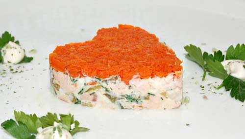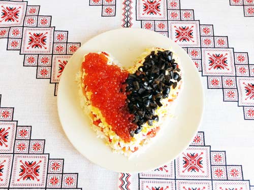 Рис отварите до готовности, выложите на блюдо в виде сердца и смажьте майонезом. Семгу, нарезанную кубиками, выложите на рис. Помидор и болгарский перец, нарезанные кубиками, перемешайте, выложите на семгу и смажьте майонезом. Следующим слоем выложите измельченные яйца. Украсьте одну половину сердца красной икрой, а вторую – нарезанными маслинами.