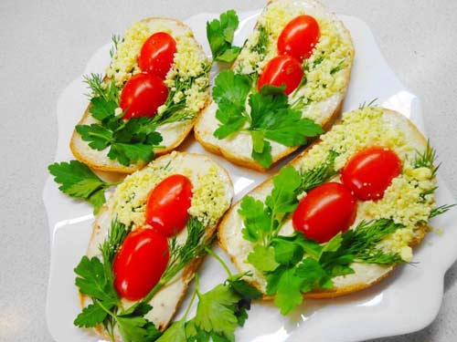 Яйца отварите вкрутую, остудите, очистите и отделите желтки от белков. Кусочки белого хлеба подсушите в тостере или духовке, смажьте плавленым сливочным сыром. Сверху выложите половинки помидоров черри в виде цифры восемь. Украсьте веточками зелени. Из раскрошенного яичного желтка сделайте цветы мимозы.