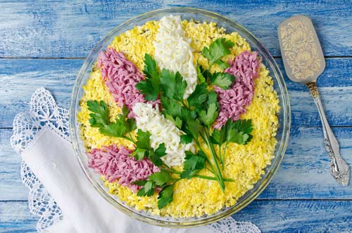 Рыбные консервы разомните вилкой. Если масла много, часть его слейте. На плоскую тарелку с помощью кулинарного кольца выложите рыбу первым слоем. Смажьте рыбу майонезом. Следующим слоем выложите натертую на средней терке очищенную сырую морковь, сверху – измельченный чеснок, чуточку посолите и смажьте майонезом. Далее выложите слой натертого на той же терке твердого сыра и смажьте майонезом. Затем – слой нарезанной мелкими кубиками свежий огурец, снова смажьте майонезом. Яйца отварите вкрутую, остудите и разделите на белки и желтки. Желтки разомните и покройте ими салат. Майонезом верхний слой не смазывайте. Белки натрите на мелкой терке, разделите пополам. Одну половину белков оставьте белыми, а в другую добавьте сок свёклы и перемешайте. Сверху украсьте салат, выкладывая по 1/2 ч. л. белков разных цветов в виде овальных комочков, расположив между ними веточки петрушки, чтобы получилась веточка сирени. Дайте салату настояться в прохладном месте 15-20 минут.