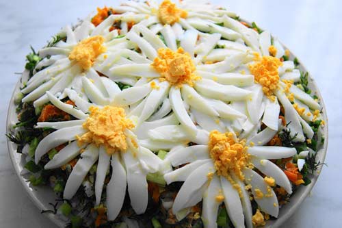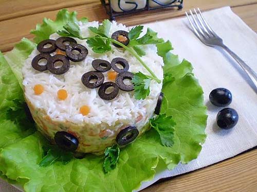 Рис отварите в подсоленной воде до готовности. Морковь натрите на крупной терке и спассеруйте на растительном масле. Яйца отварите вкрутую, остудите и очистите. Уложите салат слоями: рваные листья салата; рис (смажьте майонезом); рыба без жидкости, размятая вилкой (смажьте майонезом); нашинкованный лук (смажьте майонезом); обжаренная морковь (смажьте майонезом); мелко порубленный огурец (смажьте майонезом). Сверху выложите «ромашки» с лепестками из белков яиц, нарезанных соломкой, и сердцевины из измельченного желтка. Украсьте салат укропом.