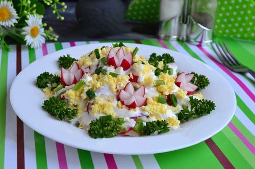 100 г отварного куриного филе, 1 свежий огурец, 10 редисок, 2 яйца, сваренных вкрутую, 3 ст. л. сметаны (15-20%), 1/2 пучка зеленого лука и зелени чеснока, зелень петрушки для украшения, соль – по вкусу.
