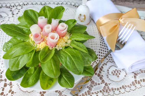 2 картофелины, 1 морковь, 300 г шампиньонов, 4 яйца, сваренных вкрутую, 2 ст. л. майонеза, 1/2 ч. л. соли, 1 пучок щавеля или шпината, 1 редис, 20 мл растительного масла.