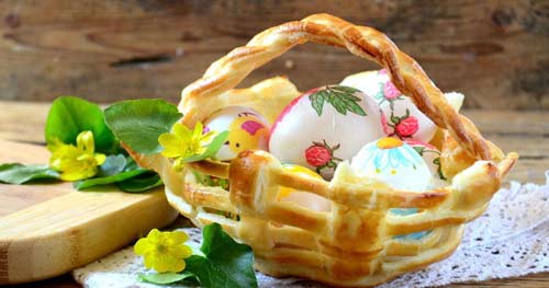 Если вы хотите украсить свой пасхальный стол не только собственными куличами, но и сложить красивые пасхальные яйца в съедобную корзинку, Батюшка Домовой предлагает вам попробовать сделать такую корзинку самостоятельно из слоеного теста. Обратите внимание, что классические корзинки делают из сдобного теста, а из слоеного они получаются менее прочными, поэтому лучше сделать несколько маленьких корзинок, если у вас много пасхальных яиц.