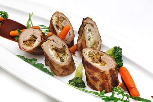 Очень тонко отбейте мясо. Мелко нарежьте лук и грибы. Пожарьте сначала лук, затем грибы. На пищевую пленку положите отбитое мясо, сыр и начинку и плотно заверните. Затем заверните в пищевую пленку и оставьте в таком состоянии, чтоб получились красивые рулетики и не развернулись при выпекании. Рулетики смажьте маслом и посыпьте солью и перцем. Запекайте в духовке при 200°С примерно на 25-30 минут.