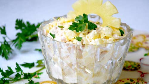 500 г филе грудки индейки, 500 г ананаса, 150 г салата «Айсберг», 150 г консервированной кукурузы, 150 г сметаны, зеленый лук, соль, перец, сухие травы, специи – по вкусу.
