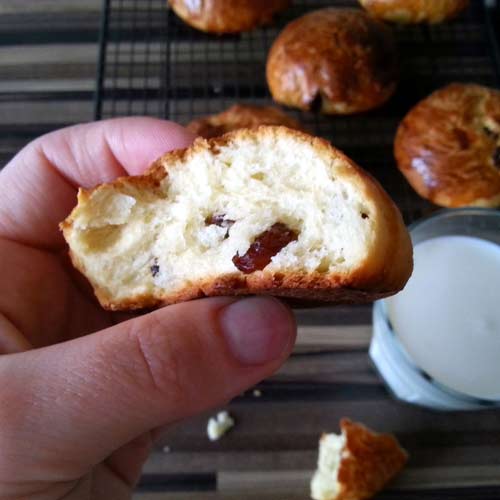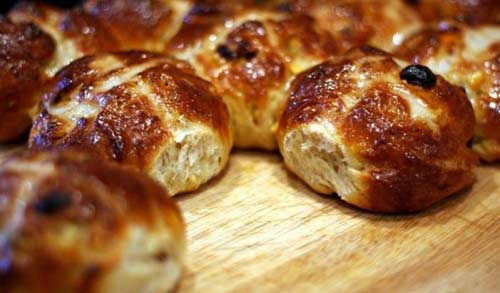 В теплом молоке растворите дрожжи и 1 ч. л. сахара. Оставьте на 15 минут в теплом месте, до появления пузырьков. Добавьте соль, яичные желтки и растопленное сливочное масло, размешайте. Затем добавьте сахар-сырец и просеянной мукой замесите мягкое тесто. Муку вводите частями, хорошо вымешивая. Изюм промойте, залейте кипятком на 15 минут, обсушите и перемешайте с небольшим количеством муки. Из теста сформируйте колобки, оставьте на расстойку на 15-20 минут. Для украшения смешайте 3 ст. л. молока, муки и 1 ч. л. растительного масла, нарисуйте узор кондитерским шприцом крест на крест. Выпекайте булочки 20-30 минут в горячей духовке при 200°C. Для глазури смешайте горячее молоко и сахарную пудру, размешайте. Как только булочки будут готовы, смажьте их глазурью.