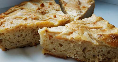 Яйца взбейте с сахаром до белого цвета. Добавьте сливочное масло комнатной температуры и творог, хорошо взбейте до однородной массы. В просеянную муку добавьте разрыхлитель и соль, перемешайте. Яблоки очистите, нарежьте на дольки, одно яблоко нарежьте мелко и вмешайте в тесто. Распределите тесто в форме, сверху уложите дольки яблок и отправьте в духовку, при температуре 180°С в течение 20-30 минут.