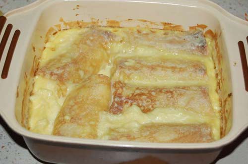 Для блинов: 700 мл молока, 2 яйца, 1 ч. л. соды, 1/2 ч. л. уксуса 6%, 1 ч. л. соли, 2 ч. л. сахара, 3 ч. л. растительного масла, 230-250 г муки. Для начинки: 600 г куриного филе, 5 грибов шампиньонов, 1 луковица, 2 ст. л. сметаны, 1/2 ч. л. муки, соль, перец – по вкусу. Для соуса Бешамель: 50 г сливочного масла, 60 г муки, 700 мл молока, соль, перец – по вкусу. Сыр – для посыпки.