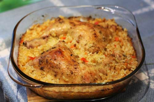 Заранее замаринуйте курицу в сметане с солью и специями. Мелко нарежьте лук, натрите на терке морковь, рис промойте. В большую форму для запекания выложите лук, морковь и рис, перемешайте, посолите и поперчите. Сверху выложите курицу, залейте водой, чтобы она покрывала рис на 1 см и накройте фольгой, сделав дырочки для выхода пара. Выпекайте 50 минут в духовке при 180°С, затем уберите фольгу и верните форму в духовку до готовности риса и курицы, примерно на 20 минут. При необходимости можно долить еще воды.
