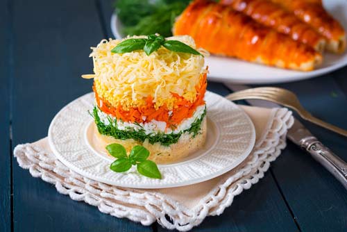 Первым уровнем выложите на блюдо измельченный бланшированный лук, покройте его майонезом. Вторым уровнем выложите крупно натертое яблоко, покройте майонезом. Третьим слоем – 2 нарезанных яйца и снова майонез. Четвертый слой – мелко натертая морковь, смазанная майонезом. Присыпьте все слои мелко натертым сыром и повторите все слои в той же последовательности, начиная с яблока и заканчивая сыром. Подавайте блюдо в нарезанном виде с помощью широкой лопатки (для торта).