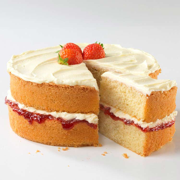 Это шифоновый бисквит с нежной начинкой из клубники и взбитых сливок. Можно использовать джем и крем-чиз. Шифоновый – это особая разновидность бисквита, который готовится с маслом. Он более влажный и тяжелый. Зато в отличие от классического, может использоваться без пропитки и крема.