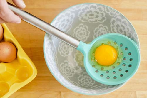 Как отделить желток от белка при помощи пустой пластиковой бутылки, знают, кажется, все. Но есть способ проще. Вам понадобятся обычная лопатка с отверстиями (можно заменить ложкой с дырками) и емкость для белков.