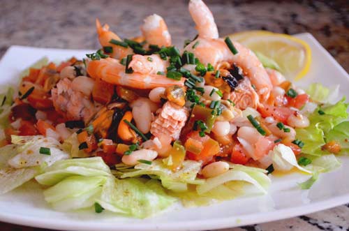 Почистите и вымойте кальмары. Хорошо промойте сердцевидки и мидии. Желательно обдать кипятком. Налейте в объемную кастрюлю воду и вино, положите приправы и луковицу, доведите до кипения. Отварите в этом бульоне кальмары в течение 10 минут и выньте шумовкой. Затем бросьте в воду сердцевидки и мидии, готовьте, пока они не раскроются. Затем достаньте их из воды, а нераскрывшиеся раковины выбросьте. В конце приготовления забросьте креветки в слегка кипящую воду, отварите в течение 4 минут (в зависимости от размера). Очистите раковины и креветки. Приготовьте маринад: соедините сок лимона, соль, уксус, оливковое масло. Почистите и измельчите чеснок, добавьте в маринад. Влейте подготовленный маринад к морепродуктам, влейте туда же процеженный бульон. Оставьте мариноваться на полчаса. Перед подачей салат посыпьте измельченной петрушкой и украсьте кусочками лимона.
