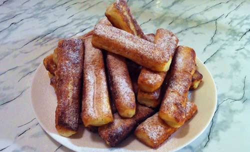 В творог добавьте соль, яйцо, ванильный и обычный сахар, сметану. В муку добавьте разрыхлитель и просейте 200 г в творог. Замесите тесто в комок, разделите его на 4 части и скатайте колбаски. Нарежьте колбаски на кусочки, примерно по 6 см, приплюсните каждый и обжарьте на разогретом масле с двух сторон. Выложите готовые палочки на бумажные полотенца, чтобы убрать лишний жир. Подавайте, посыпав сахарной пудрой.