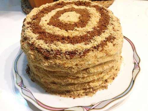 Для теста взбейте сметану с сахаром, добавьте муку, смешанную с разрыхлителем. Всё перемешайте до однородности и замесите эластичное тесто. Разделите его на 8 одинаковых кусочков. Каждый кусочек округлите и раскатайте в круглый пласт диаметром примерно 20 см. Чтобы круг был ровным, воспользуйтесь крышкой или блюдцем. Из обрезков получится еще два коржа. Поставьте сухую сковороду на огонь, разогрейте ее и выложите корж. Выпекайте коржи на умеренном огне с двух сторон. На каждую сторону нужно 2-3 минуты. Затем коржи полностью охладите. Для крема взбейте сметану с сахаром. Для оформления торта смажьте каждый корж кремом и выложите друг на друга. Боковую часть торта также смажьте сметанным кремом. Белое и шоколадное печенье по отдельности измельчите в крошку руками или блендером. Белым печеньем украсьте боковую часть сметанника, а шоколадным – верхнюю часть. Оставьте торт пропитаться в холодильнике в течение нескольких часов. Лучше всего оставить его на ночь.