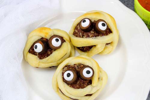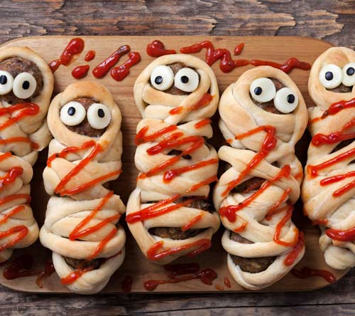 Рецепт можно упростить, заменив фарш на сосиски. Добавить чуток кетчупа – и получатся съедобные мумии.