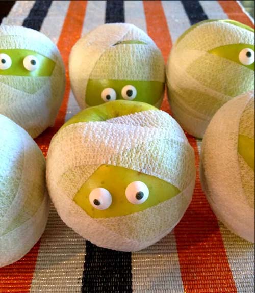 Например, если неплотно обмотать обыкновенные яблоки бинтом или белой гофрированной бумагой и добавить глазки из карамели, то получится весьма подобающе, и не очень пугающе.