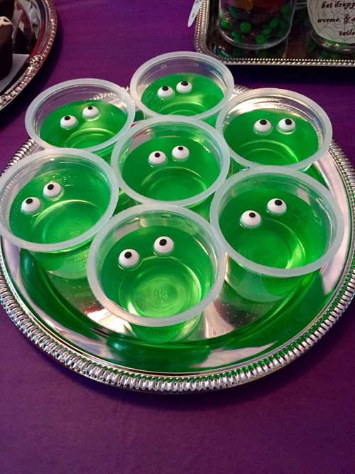 Вообще подобными съедобными глазами можно превратить практически любое блюдо в нечто достойное внимания и вызывающее улыбку, вопреки направленности темы праздника. Будь то странно зеленое желе...