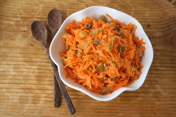 Салат из моркови с изюмом и орехами 1 морковь, 40 г мёда, 1 ст. л. изюма, 30 г грецких орехов, 1 ч. л. оливкового масла. Натрите на терке свежую морковь и залейте маслом. Измельчите грецкие орехи (можно также использовать миндаль, фундук или арахис) и поджарьте их на сухой сковороде. Изюм промойте и обсушите. Добавьте орехи и изюм к моркови. Подогрейте на водяной бане мёд и залейте им салат. Всё хорошо перемешайте, дайте настояться и подавайте к столу. |