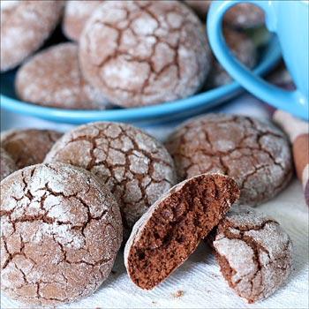 Шоколадные имбирные пряники 250 г пшеничной муки, 70 г сливочного масла, 100 г мёда, 100 г сахарной пудры, 3 ст. л. какао-порошка, 1 яйцо, 1 ч. л. разрыхлителя, 1/3 ч. л. соли, по 1/2 ч. л. мускатного ореха, молотой корицы и имбирного порошка. Мягкое масло смешайте с 70 г сахарной пудры и мёдом. Добавьте яйцо и всё перемешайте до однородности. Просейте муку, добавьте соль, специи и какао. Хорошо перемешайте. В сухую смесь добавьте жидкую и замесите тесто, не липнущее к рукам. Оберните тесто фольгой и положите в холодильник на полчаса. Отщипывая кусочки теста, скатайте из них шарики размером с грецкий орех. Обмакните каждый шарик в пудру. Противень выстелите пергаментом, выложите заготовки и чуть придавите их. Выпекайте в духовке 10-15 минут при 200°C.
